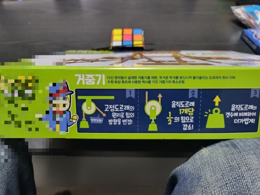박스 겉면에서는 완성된 모습과 도르래에 대한 설명이 적혀 있어요